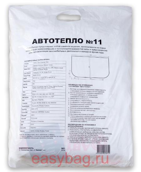 Комплект содержит в себе: пакет, утеплитель для двигателя Автотепло и технический паспорт.