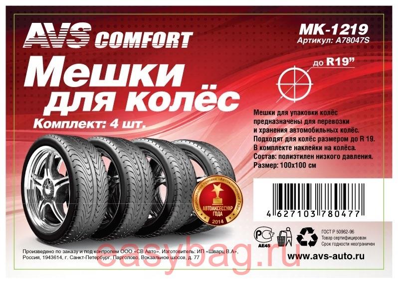Мешки для хранения колес AVS MK-1219 от 13 до R19 (100х100 см) 4 Шт. Мешки для упаковки колес предназначкны для перевозки и хранения колес. Подходят для колес радиусом от 13 до 19. в комплекте идут наклейки: переднее, заднее, правое и левое колеса. Разамер 100 на 100.