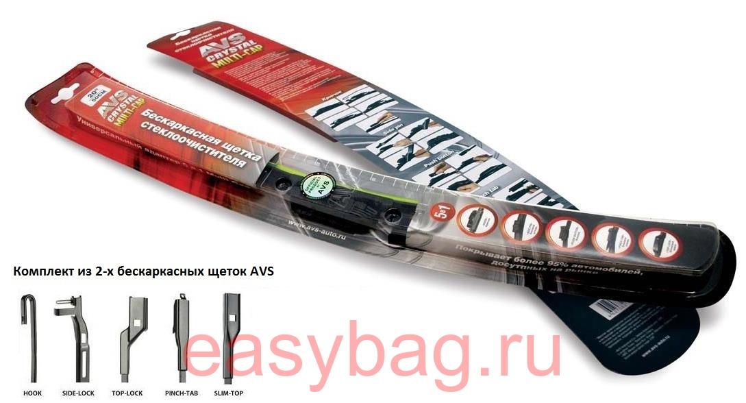 Бескаркасные щетки стеклоочистителя AVS - подойдут больше на теплую погоду, но и зимой прекрасно очистят лобовое стекло автомобиля. У бескаркасных щеток большая применяемость, так как в комплекте есть адапторы под крючок, side pin, push button, pinch tab, top lock.