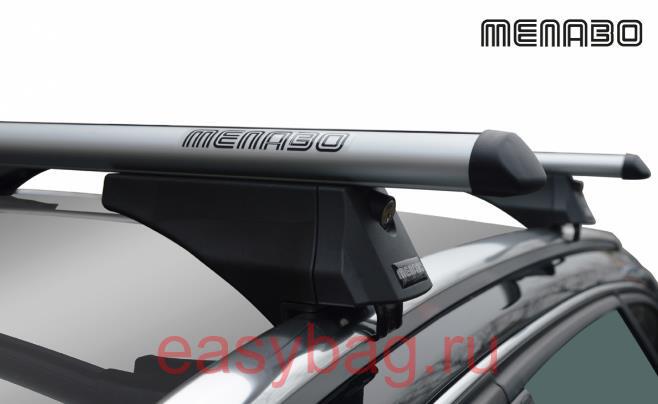 Итальянский багажник на интегрированные рейлинги Менабо Тайгер. Багажник выполнен из анодированного алюминия и усилен ребрами жесткоски внутри поперечины. Не подвержен коррозии. Каждая из 4-х опор багажника запирается на ключ. Аэродинамическая форма сокращает сопротивление воздуха, тем самым сводит шумовой эффект до минимума. В поперечине есть Т-образный слот, закрыт резинкой, для установки дополнительного оборудования, например, лыжных и велосипедных креплений. Зацеп к низким рейлингам происходит за счет металической лапки покрытой прорезиненным полимером, что исключает повреждение рейлингов. Грузоподъемность багажника до 100 кг, но за частую грузоподъемность определяет не багажник, а крыша автомобиля. Не поленитесь посмотреть в технической книге автомобиля нагрузку на крышу, это и будет Ваша максимальная грузоподъемность багажника.