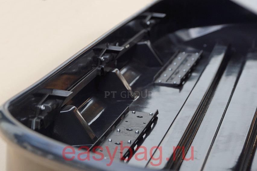 Бокс Турино 1, выполнен из пластика ABS с глянцевым покрытием. Имеет одностороннюю систему открытия крышки. В комплекте есть 4 ремня для крепления груза внутри автобокса. Крепление к поперечным дугам осуществляется за счет U-образными скобами шириной 80 мм. Центральный замок запирает крышку автобокса в 3-х местах.