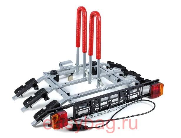 Крепление для перевозки велосипедов на прицепном устройстве Амос Титан. Крепление выполнено из стали, простая и надежная конструкция. Платформа оснащена рамкой под установку дублирующего номерного знака, так же оснащена фонарями с стоп сигналами и поворотами. Крепление запирается на ключ к шару фаркопа. Розетка с выходом в 7 pin.
