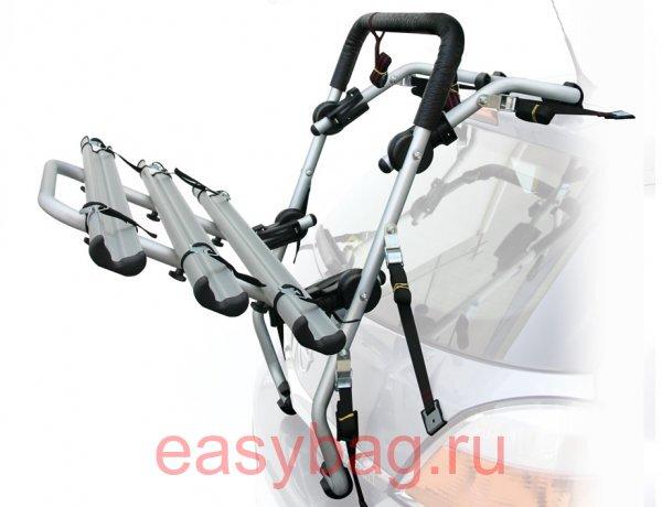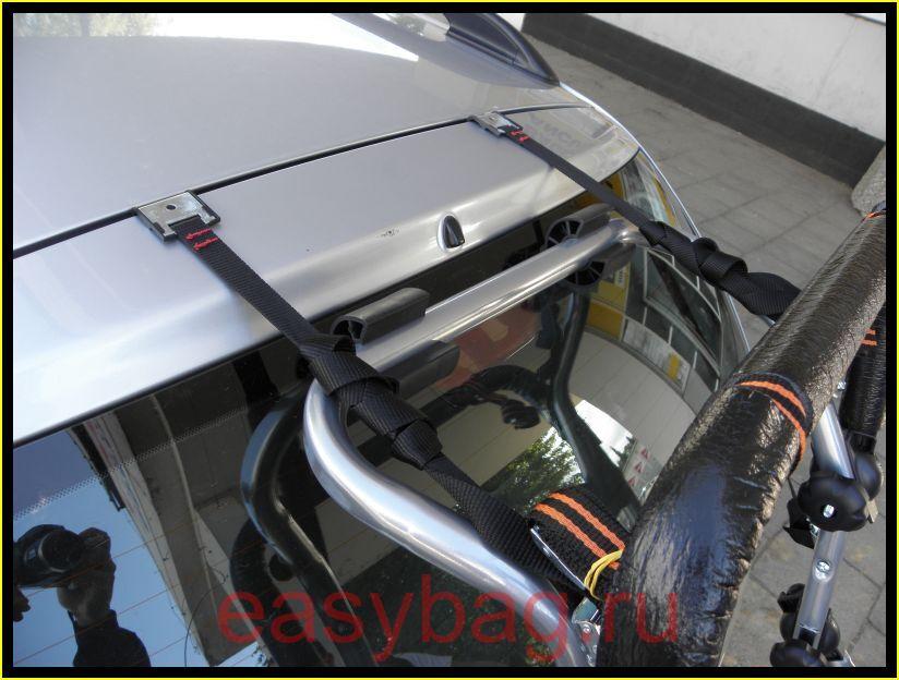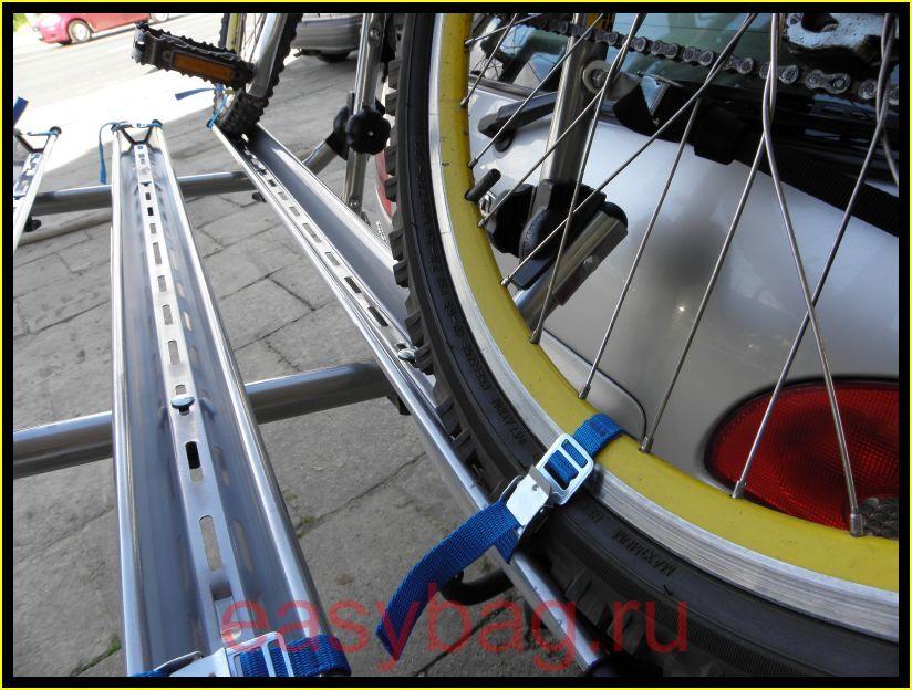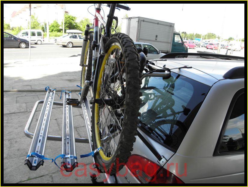 Подходит для любых велосипедов. Велосипед крепится хабами к раме и стягивается ремнями к рельсе тем самым надежно стоит в креплении. Не закрывает номерной знак и габаритные огни.