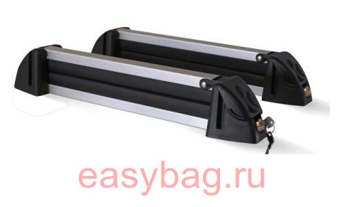 Крепление сделано из алюминия и запирается на ключ. Простое и надежное крепление. Подходит как на прямоугольные дуги так и на аэродинамические в форме овала. Не подойдет на багажник с формой крыло.