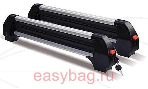 Крепление сделано из алюминия и запирается на ключ. Простое и надежное крепление. Подходит как на прямоугольные дуги так и на аэродинамические. Крепление на аэродинамические поперечины осуществляется через Т-образный паз(который закрыт резинкой).