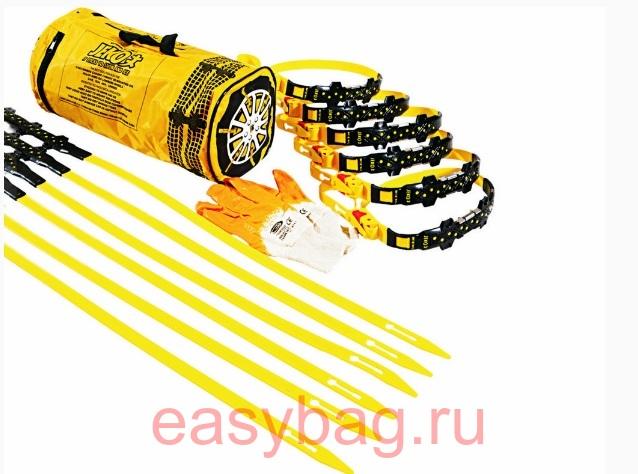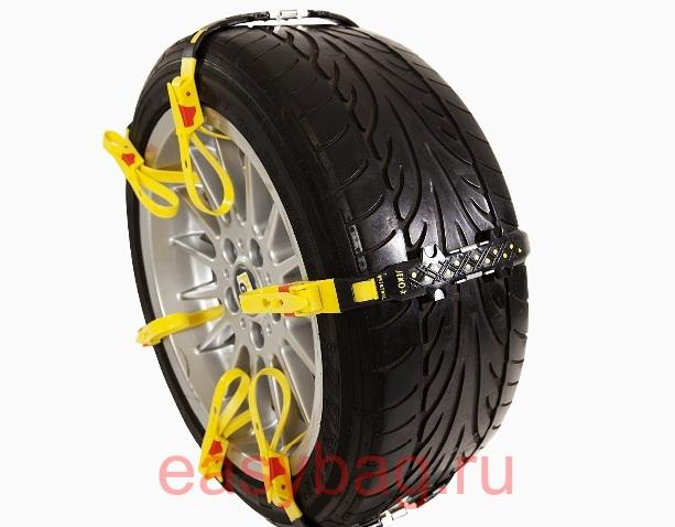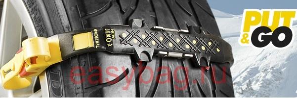 Колесные ремни для повышения проходимости «PUT&GO JEKO NEW» Пять основных отличий от предыдущей модели PUT&GO ORIGINAL: Благодаря использованию на рабочей поверхности металлической скобы, обеспечиваются великолепные сцепные свойства на льду. Новая современная упаковка, выполненная в виде привлекательного тубуса из синтетической ткани желтого цвета. Количество ремней в комплекте 12 штук, что позволяет поровну распределить на все четыре колеса; по 3 на каждое колесо для полноприводных автомобилей. Новый самозатягивающийся замок: нет фиксаторов, нет ключей. Процесс монтажа/демонтажа стал проще. Будьте осторожны при вождении с установленными ремнями. Не допускайте пробуксовки колес. Старайтесь двигаться «в натяг».