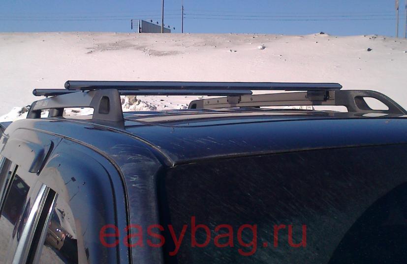 Багажник на рейлинги для Nissan Pathfinder с рейлингами питерской фирмы Атлант. Багажник снабжен секреткой в виде звездочки, что предохраняет его от снятия посторонними людьми. Так же имеет полуавтоматический зажим, что позволяет затягивая однин болт (при помощи шестигранника, который идет в комплекте) притягивать багажник к рейлингам, так и к поперечинам. Поперечины выполнены из аллюминия. Грузоподъемность 100 кг на рейлинги.
