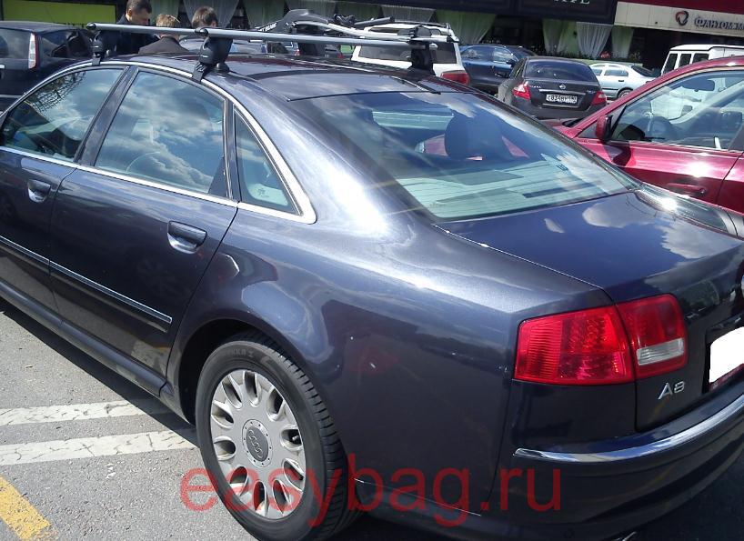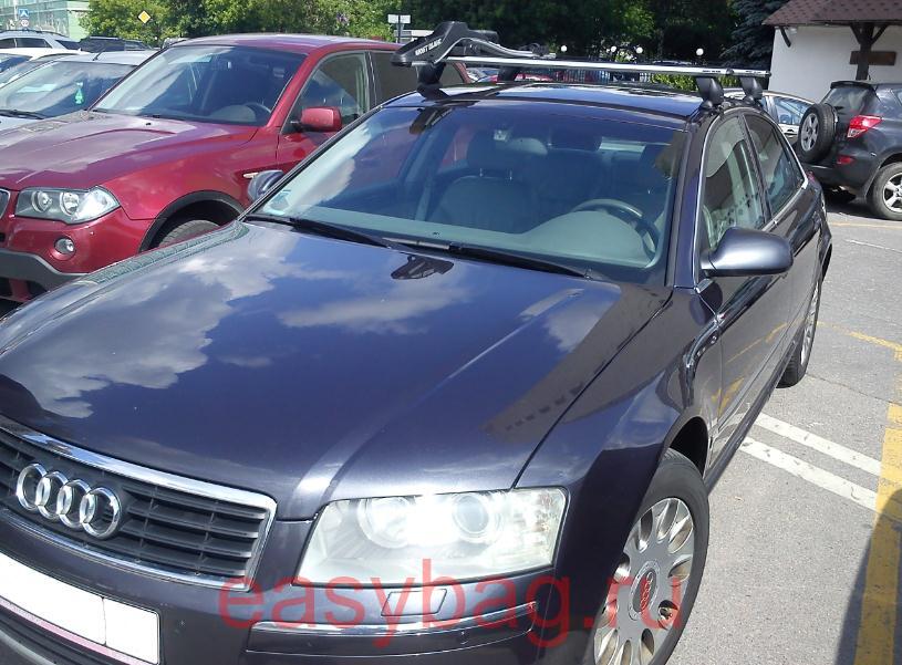 Крепеж осущесталяется за дверной проем. Все части багажника в местах соприкосновения с автомобилем AUDI A8 седан прорезинены и политы специальными полимерами во избежания различных царапин и сколов.