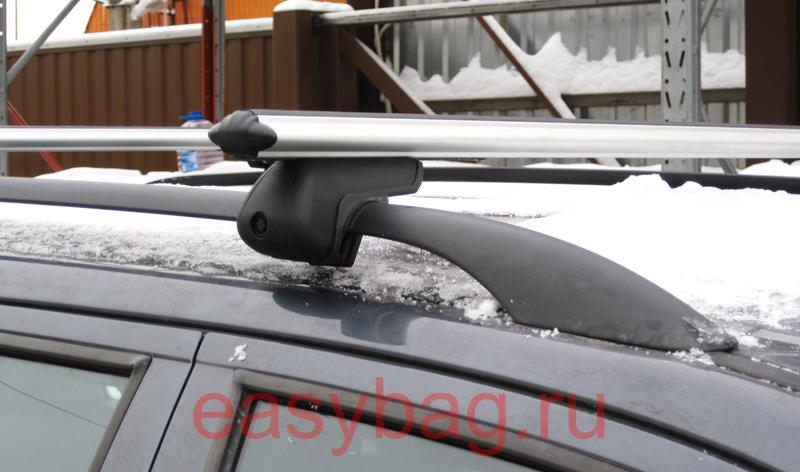 Багажник на рейлинги питерской фирмы Атлант. Багажник снабжен секреткой в виде звездочки, что предохраняет его от снятия посторонними людьми. Так же имеет полуавтоматический зажим, что позволяет затягивая однин болт (при помощи шестигранника, который идет в комплекте) притягивать багажник к рейлингам, так и к поперечинам. Поперечины выполнены из аллюминия. Грузоподъемность 100 кг на рейлинги.